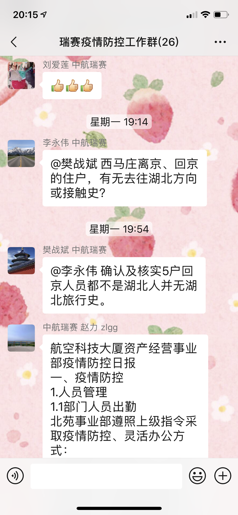 其实,在疫情发生之初,公司领导班子就对疫情非常重视,第一时间召开党委会暨疫情防控领导小组专题会议,通过视频会议,研究部署疫情防控工作,指导各部门积极开展防疫期间重点工作。疫情期间,李永伟等领导班子成员实时统筹部署重点防疫防控工作,密切监控各下属单位疫情情况、防控措施、人员管控及一线工作开展情况,根据上报情况实时进行批示、指导、监督,赴北苑航空科技大厦、瑞赛苑区等地检查防控部署情况,看望慰问一线干部职工。同时,组织各部门制定疫情期间灵活办公,对近期工作计划、各项工作指标进行评估。综合管理部居中协调,上传下达,统筹调配各单位、各部门防控工作开展及物资储备等工作。人力资源部为保证工资正常发放、维持稳定,排除困难,进行统计,与计划财务部一起按时发放工资,确保员工情绪安定;计划财务部同时进行各类测算工作。党建文宣部积极开展疫情防控宣传工作,解读各项国家政策、进行各类防控知识科普、及时传达公司动态;工会广泛咨询渠道,通过各种方式,协助寻找口罩、消毒用品等购买渠道,保障员工需求。战略资本部、地产事业部、资产经营事业部、航空科技大厦资产经营事业部密切掌握和联系京内京外各下属单位、各个项目的疫情防控情况,每日上报最新数据,并针对实际情况及时请示领导,提出建议......